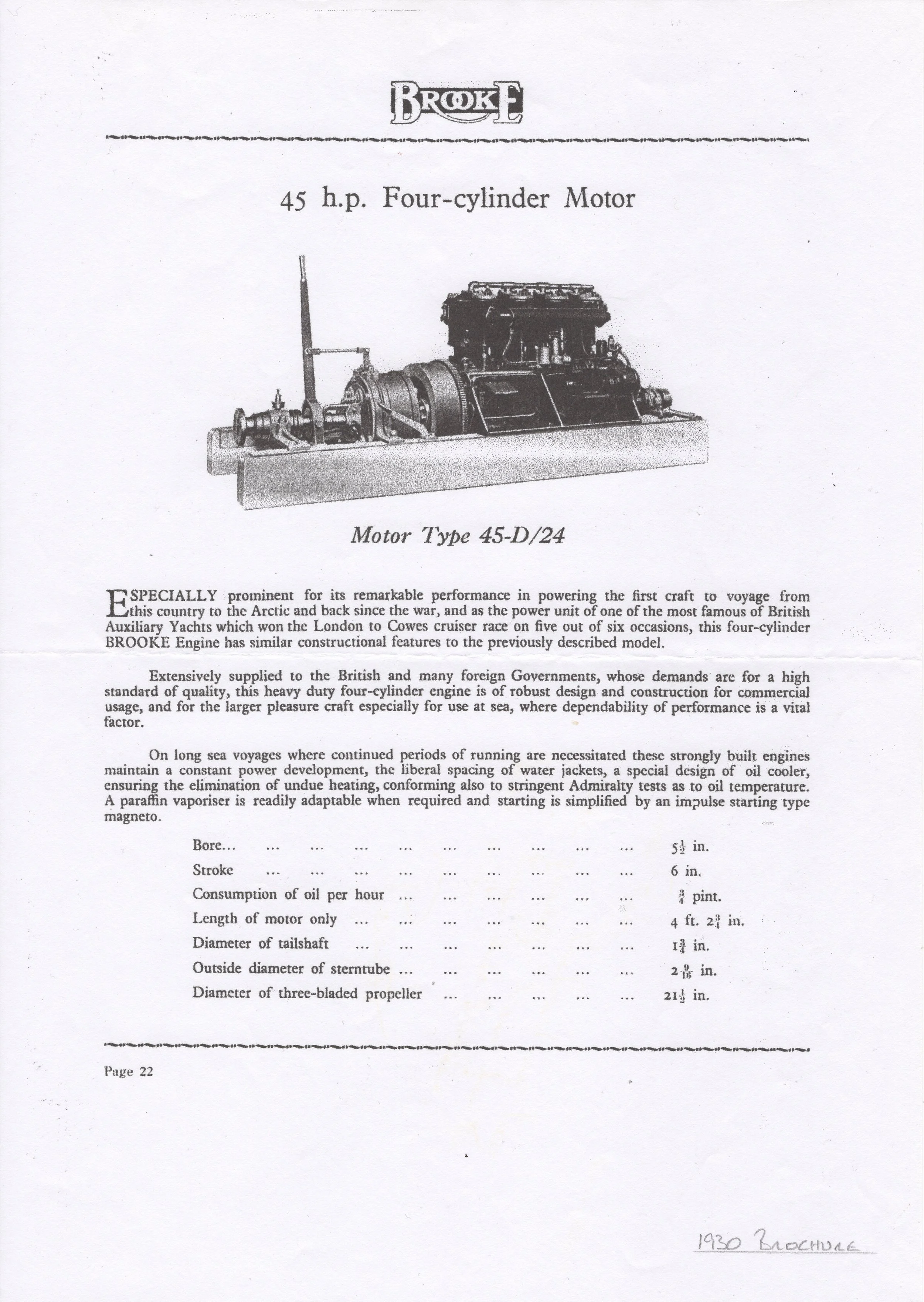 The 45-D/24 four-cylinder marine-motor seen below is a later version of an original Brooke 45 h.p. Marine-Motor, that was retro-fitted for use on the Loch-Long Torpedo Range at Arrochar in 1913.